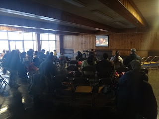 I was downstairs in the boxing gym while the movie was going on upstairs. While near the front desk of the field house, I overheard a guy from one of the local news stations say that he thought the movie was on the outside. "If it was, that would have made a good story!" he said. The field house manager assured him that no one was sitting outside in the cold watching the movie.